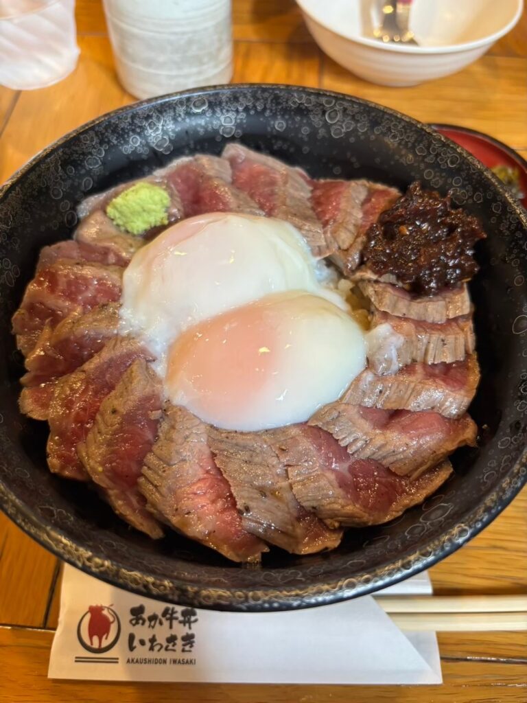 早速腹ごなししました。「あか牛丼 いわさき」さん、とりわけ用の器などあり、子連れにも優しく良かったです。